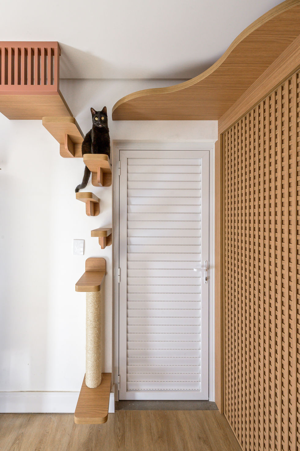 para encantar os felinos e seus humanos. esse cantinho da casa dos clientes foi “gatificado”, com prateleiras verticais que contribuem para o enriquecimento ambiental dos pets.