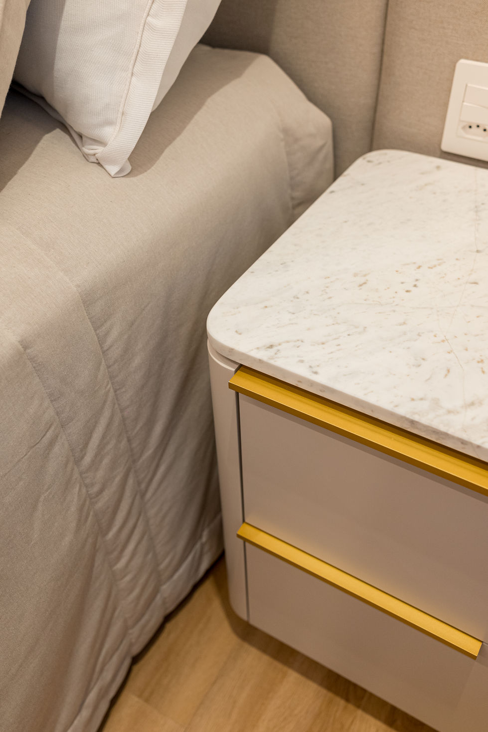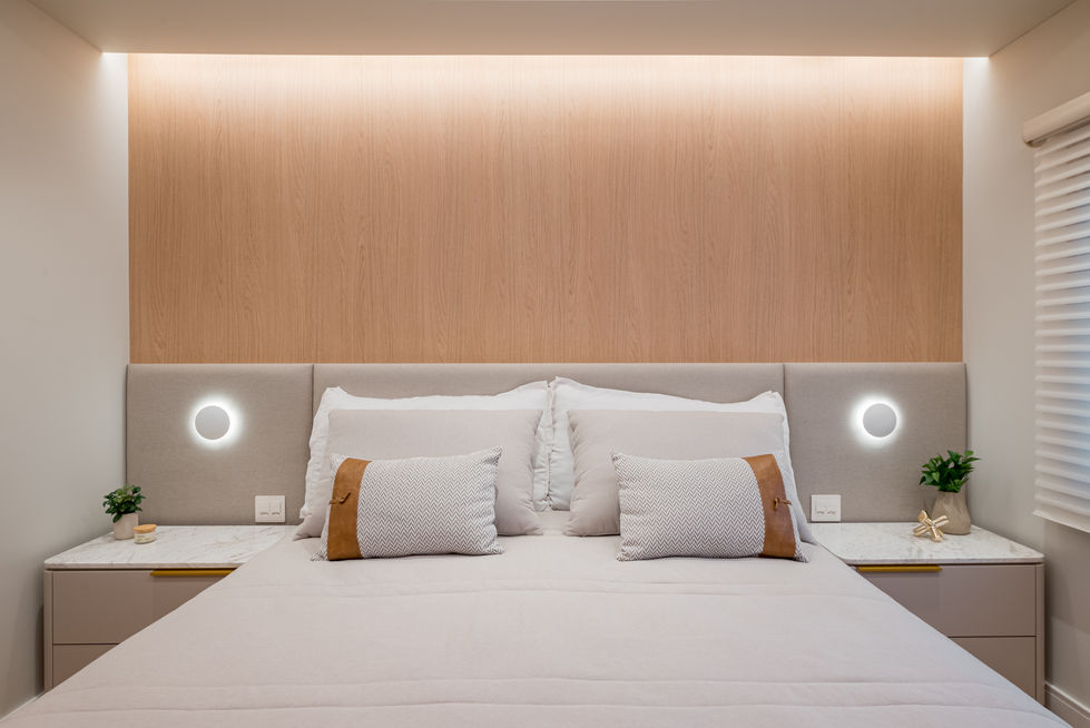 nesse projeto de dormitório de casal e infantil, o arquiteto trouxe uma atmosfera leve e aconchegante, trabalhando com diversas texturas e uma paleta de cores neutra em ambos ambientes.
